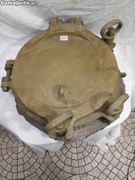Vigia ferro e bronze, peça recuperada de antigo navio. A vigia ainda tem bocados da chapa do costado do navio. É uma vigia de tubo em ferro com 5 Cm. de altura, a porta de combate é de bronze. O aro de vidro é em bronze. O vidro tem 25 Cm de diâmetro. A vigia tem 3 grampos em bronze para fechar. Diâmetro exterior da vigia 33 Cm. Peça rara vou para colecionadores. Preço 425 Euros