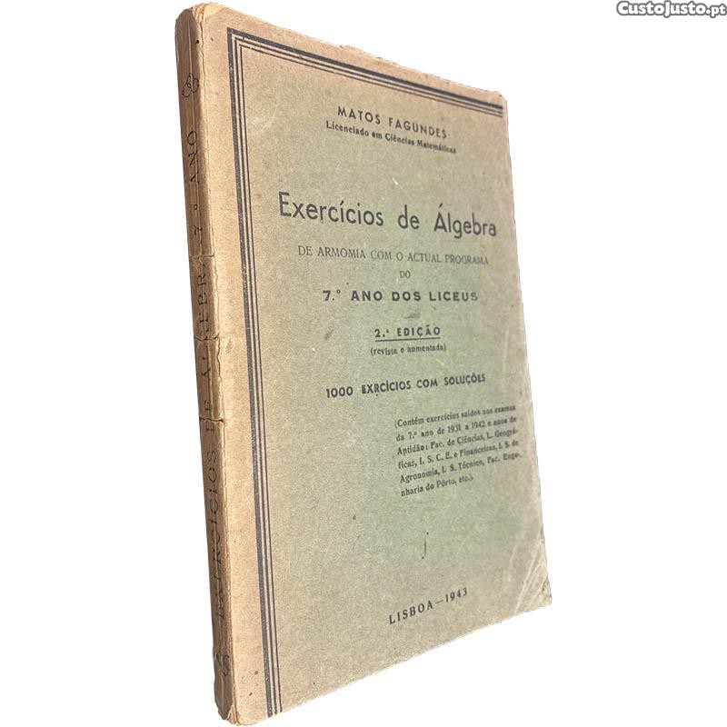 Exercícios de álgebra (7.º Ano dos Liceus) Matos Fagundes Livraria Clássica Editora De armonia com o actual programa do 7.º ano dos liceus. 1000 exercícios com soluções. Contém exercícios saídos nos exames do 7.º ano de 1931 a 1942 e anos de Aptidão: Fac. de Ciências, L. Geográficas, I. S. C. E. e Financeiras, L. S. de Agronomia, I. S. Técnico, fac. Engenharia do Pôrto, etc. 2.ª Edição (revista e aumentada). Lisboa, 1943. Livro com assinatura de posse. Alguns riscos a caneta na correção de exercícios. Y225-X