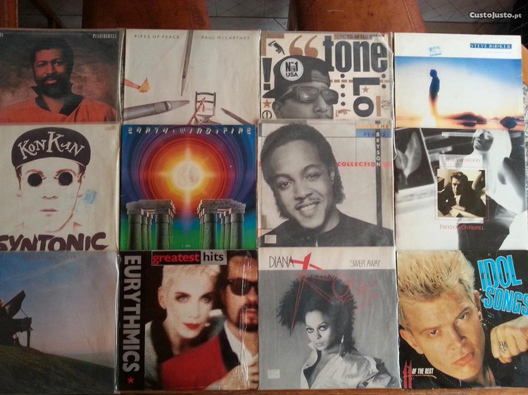 Lote variado de discos de vinil Foto 1: Billy Idol - Idol Songs - 11 of the best X Steve Winwood - Freedom Overspill X Steve Booker - Dreamworld 7.50E Diana Ross - Swept Away 15E Peabo Bryson - The Peabo Bryson collection 5E Tone Loc - Loc'ed After Dark X Eurythmics - Greatest Hits X Earth, Wind and Fire - I am 32.50E Paul Mccartney - Pipes of peace X Christine Mcvie - Christine Mcvie 10E Kon Kan - Syntonic 5E Teddy Pendergrass - Love Language 7.5E Foto 2: Kool & The Gang - Emergency X Silent Circle - N1 40E Lisa Stansfield - Affection 3E Varios - Country Life V 5E Men at work - Cargo 6E Bonnie Tyler - Faster than the speed of night X Bob Seger and the silver bullet band - The Distance X Survivor - When seconds count 2E Alexander O'neal - Hearsay 2,50E Heaven 17 - Penthouse and Pavement 15E New Musik - From A to B 5E Laura Branigan - Touch 5E Foto 3: Silent Circle - N1 40E Madonna - You can Dance 6.50E Freeez - Gonna Get you 5.50E Lita Ford - Dancin' on the edge 10E Manowar - Kings of Metal X Strange Advance - Worlds Away 7.50EUR UB40 - Geffery Morgan... 4EUR Rick Astley - Whenever you need somebody X Cretu and Thiers - Belle Epoque 10EUR Varios - Flashdance Soundtrack 4EUR T'Pau - Bridge of spies 2EUR Ashford & Simpson - Solid 5EUR Foto 4: Eye to Eye - Eye to Eye 5EUR Varios - Footloose Soundtrack X Bryan Ferry - Boys and Girls 6.50EUR INXS - Kick X Cerrone - Cerrone IV - The Golden touch X Dire Straits - On every Street X Pink Floyd - The Wall (sem capa) X Madonna - True Blue X Fun Fun - Color my Love 3EUR Giorgio Moroder & Philip Oakey - Together in electric dreams 4EUR Julie - I'm in love with Michael Jackson Answerphone 6,50EUR Peter Schilling - Terra Titanic X Marcel Fobert & Folie Club - Rap Folie 4EUR X = Indisponível Posso mostrar em mão na zona de Almada ou envio para todo o País (via CTT), pagamento por transferência bancária ou MBway. Não faço envios à cobrança. Veja os meus outros anúncios.