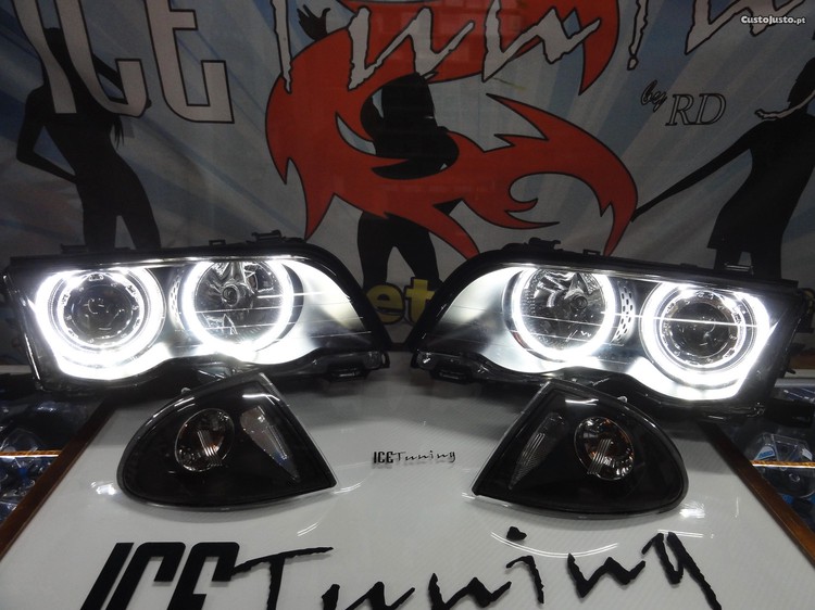 Preço: 299 €Faróis frontais angel eyes BMW E46 4 portas / limosine 98-01 fundo preto com angel eyes em branco