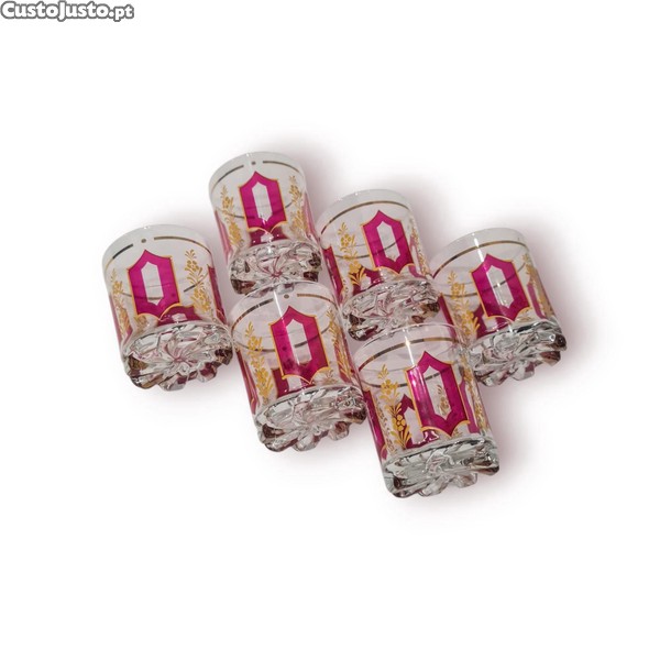 Conjunto elegante de 6 copos italianos Devalbar, produzidos em cristal decorado com detalhes em rosa framboesa e dourado, com lapidação trabalhada na base.