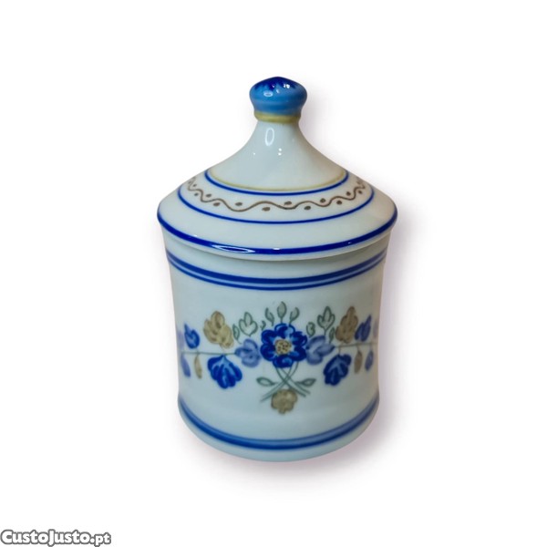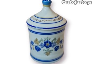 Charmoso pote de porcelana da icónica fábrica Viana do Castelo, totalmente pintado à mão, com motivos florais em azul e dourado um estilo tradicional muito procurado por colecionadores e apreciadores da cerâmica portuguesa.