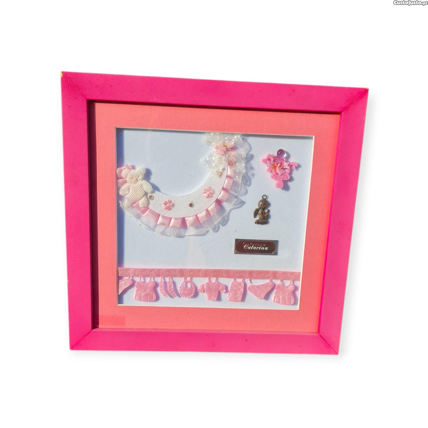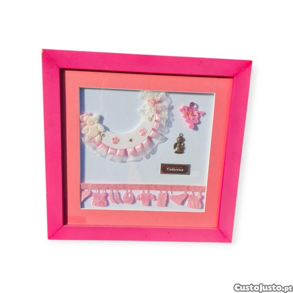 Delicado e personalizado, este quadro comemorativo de nascimento é uma peça única da marca Bela Jóia (Portugal), dedicada à chegada da menina Catarina . Com moldura em tons de rosa, inclui apliques tridimensionais de bebé, fita It s a Girl , detalhes florais, laço em tule e um pequeno anjinho em metal. No centro, a plaquinha prateada gravada com o nome Catarina confere charme e valor sentimental.