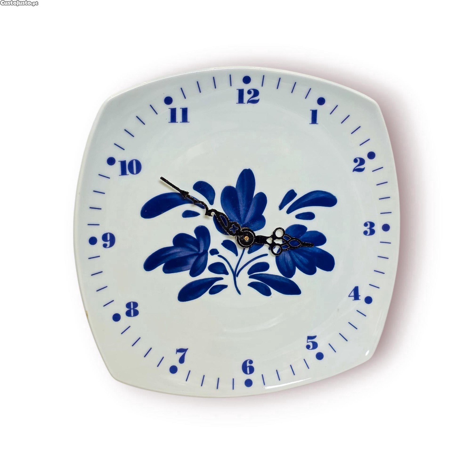 Peça decorativa portuguesa com muito charme, marcada Viana do Castelo Portugal, em porcelana/cerâmica branca com decoração floral azul de inspiração tradicional. Um objeto que junta o encanto da faiança decorativa ao formato de relógio de parede, ideal para quem aprecia peças portuguesas com identidade regional.