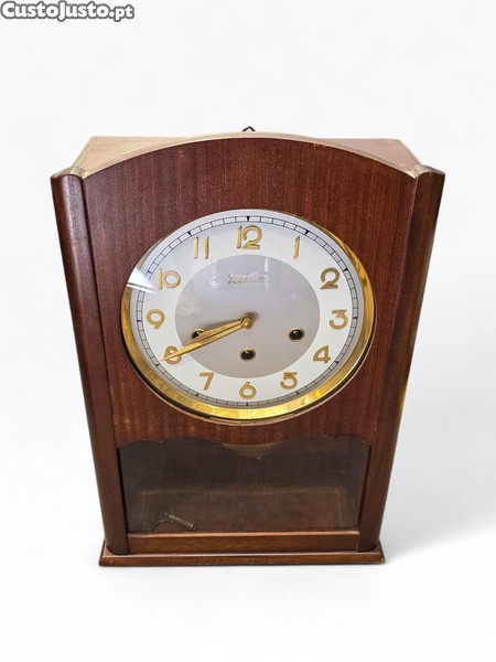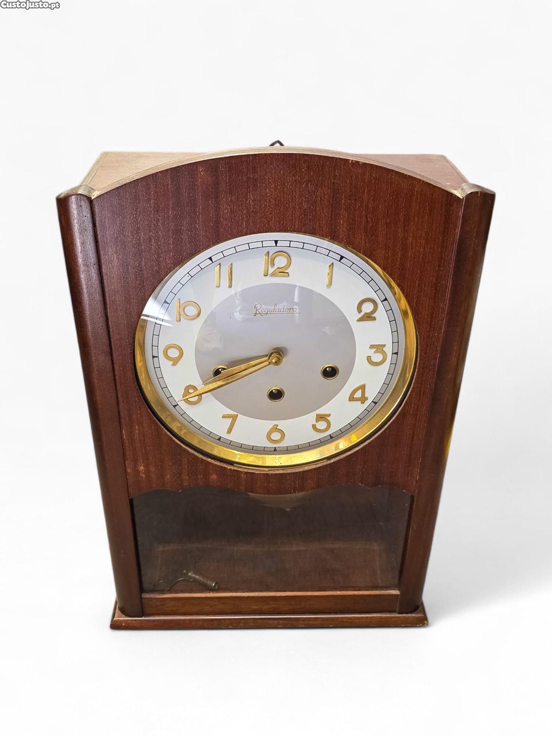 Elegante relógio de parede vintage da prestigiada marca portuguesa Reguladora, produzido em Vila Nova de Famalicão. Uma peça clássica de relojoaria tradicional, com caixa em madeira maciça e mecanismo mecânico de corda, equipada com carrilhão musical.