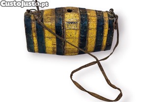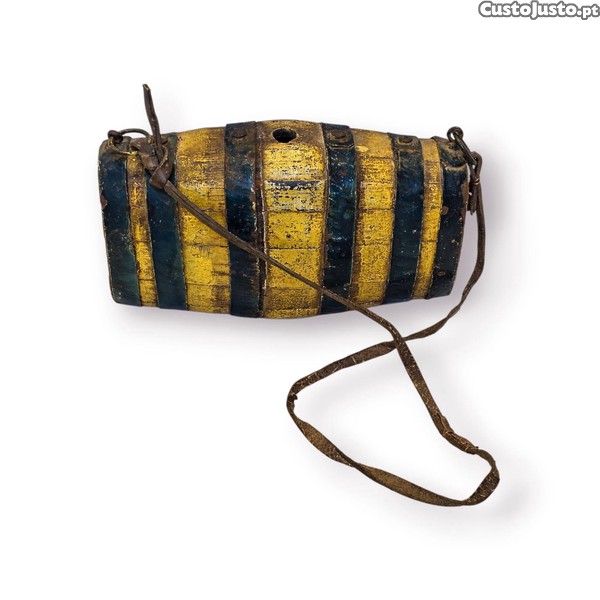 Antigo Frasco Pólvora Madeira Policromada Forma Barril com Correia Original em Couro | Peça de Carácter Histórico