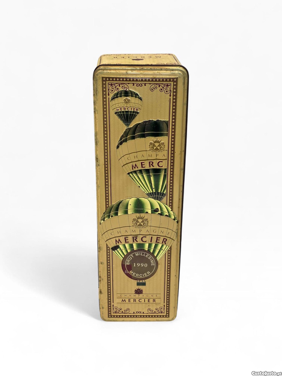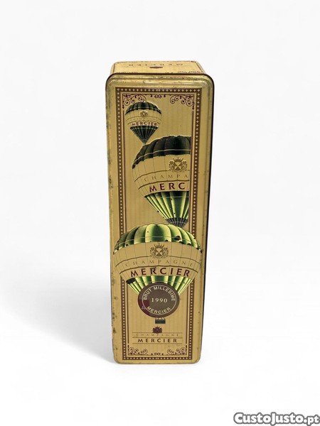 Elegante caixa metálica vintage da prestigiada marca francesa Champagne Mercier, originalmente destinada a acondicionar uma garrafa de champanhe Millésime 1990.