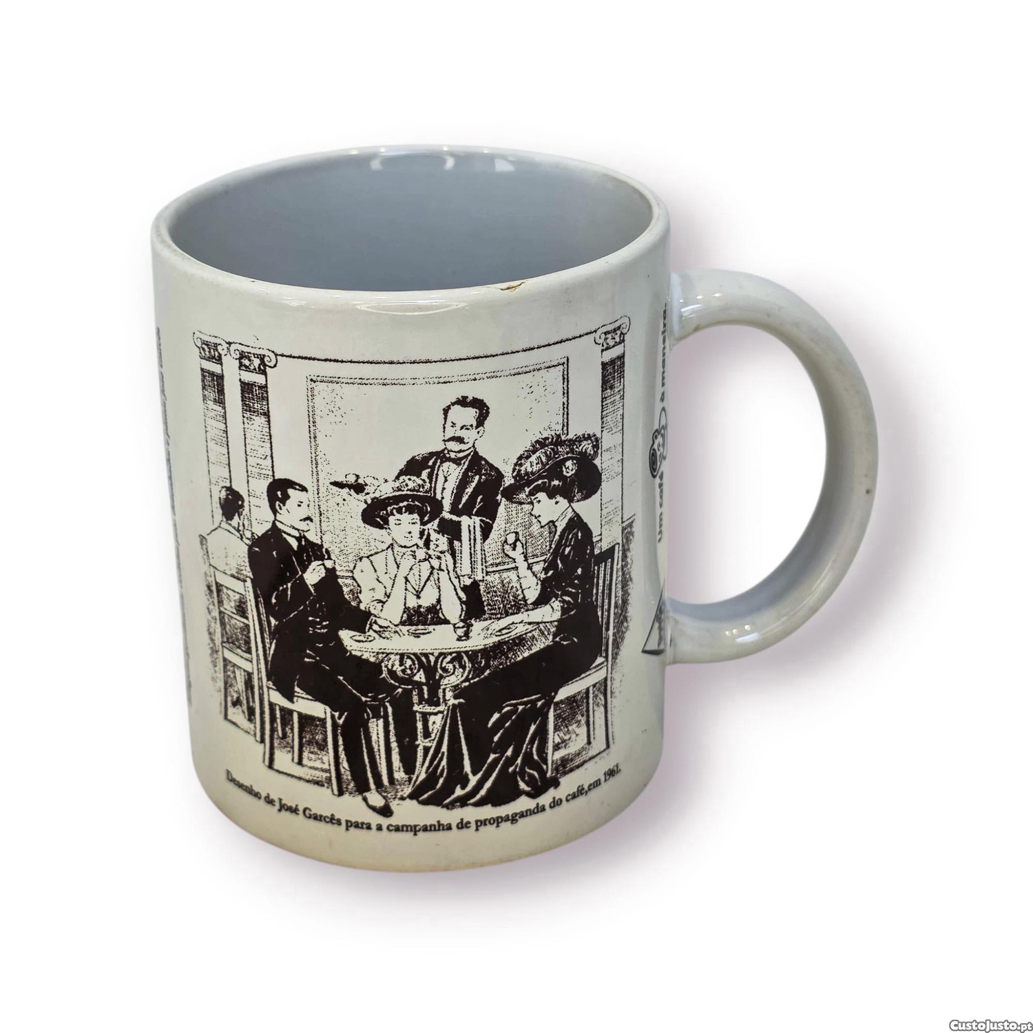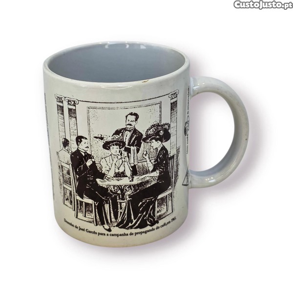 O desenho em preto sobre fundo claro cria um efeito gráfico clássico e elegante, tornando esta caneca interessante não só para uso diário, mas também para colecionadores de publicidade antiga, peças Delta Cafés e objetos decorativos com tema português.