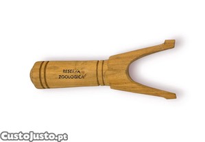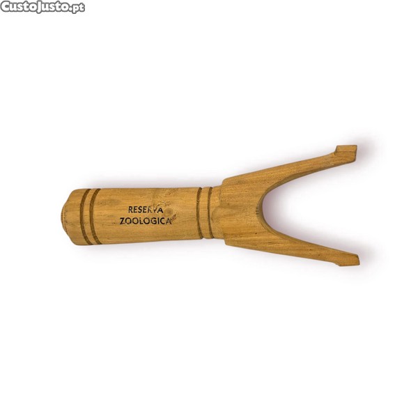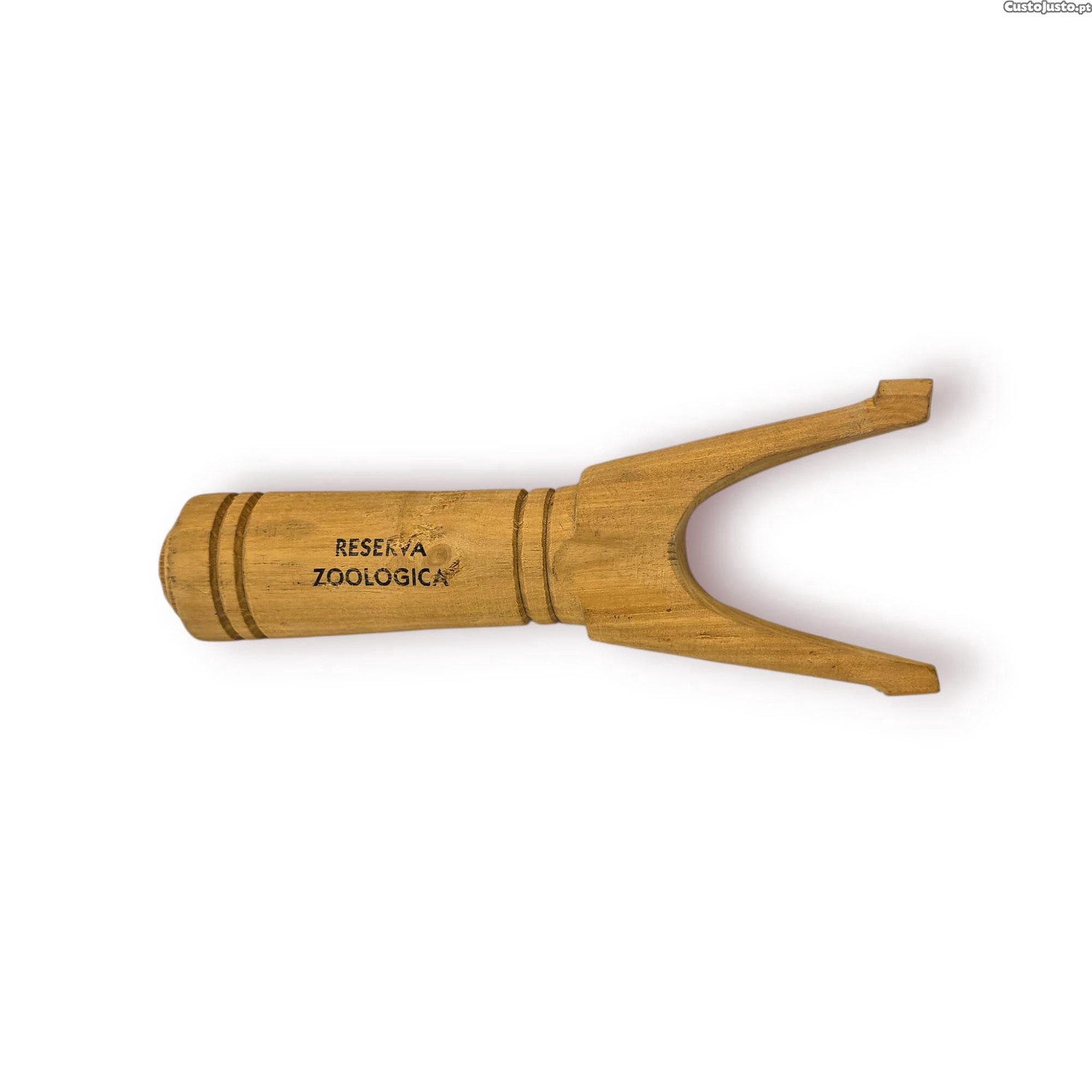 Estilingue artesanal em madeira maciça, com gravação Reserva Zoológica , representando um clássico objeto de lazer tradicional que atravessou gerações.