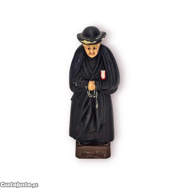 Com detalhes pintados à mão e expressão marcante, representa um sacerdote em oração, segurando um rosário, evocando tradição e espiritualidade. O desgaste visível reforça o seu carácter vintage e autenticidade.