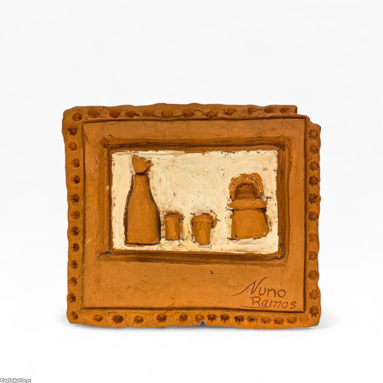 Peça decorativa em cerâmica artesanal em baixo-relevo, representando uma natureza morta com garrafa, recipientes e elemento de cozinha tradicional.