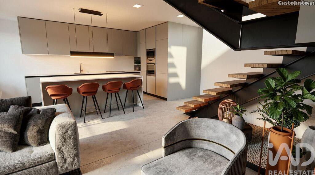 No rés do chão, encontra uma ampla e luminosa zona em open space com 46 m², que integra sala de estar, sala de jantar e cozinha totalmente equipada, proporcionando um ambiente moderno e acolhedor.