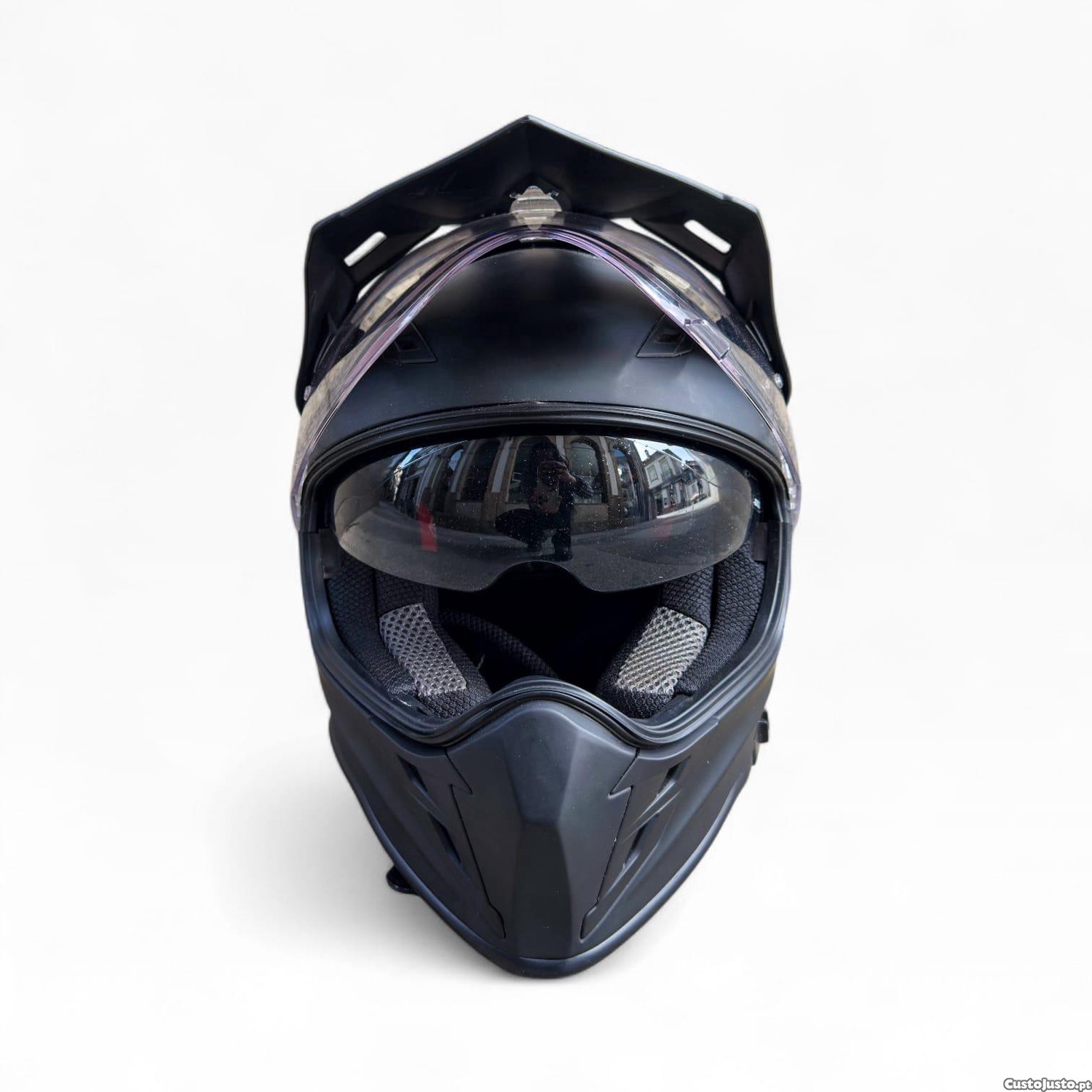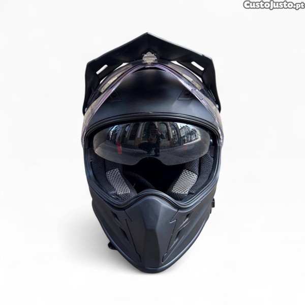 Modelo versátil com pala superior e viseira transparente integrada, permitindo utilização tanto em estrada como em trilhos off-road. Interior acolchoado e respirável, garantindo conforto mesmo em utilizações prolongadas.