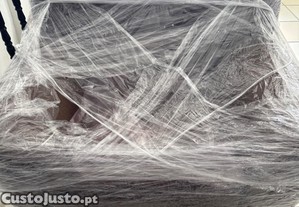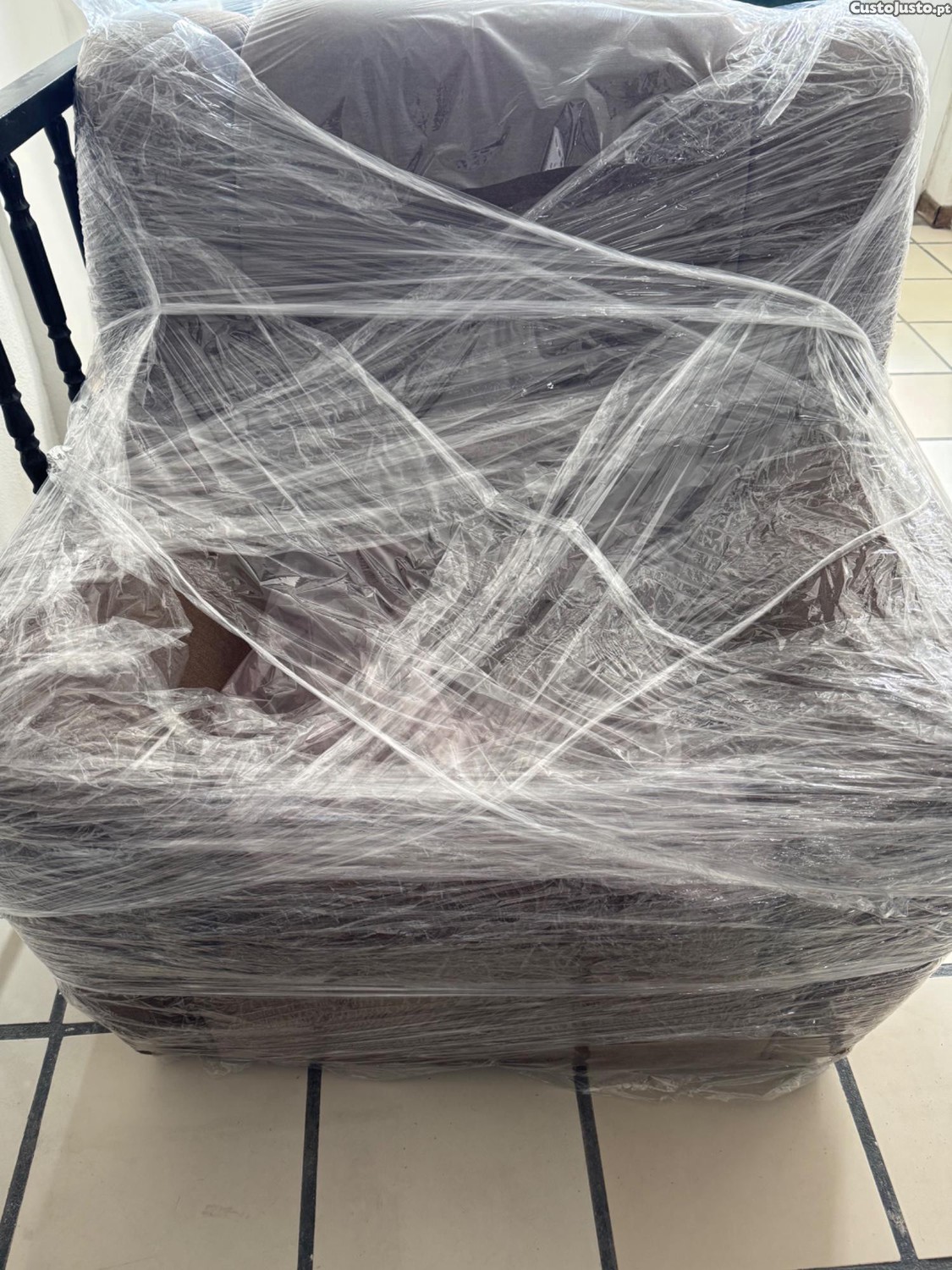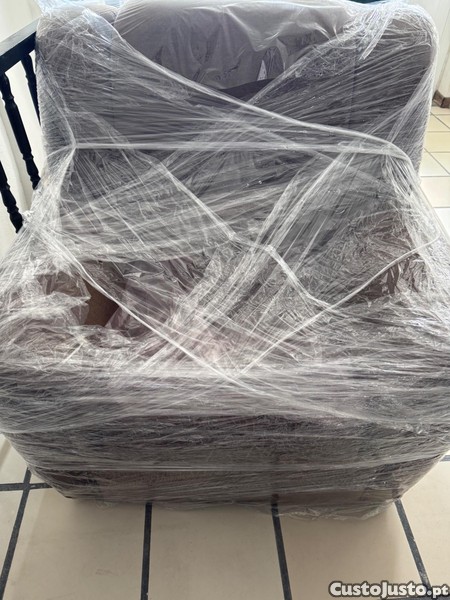Cadeirão de sala de estar embalado em plástico para proteção durante o transporte. Possui um design confortável e elegante, ideal para complementar a decoração da sua sala de estar.
