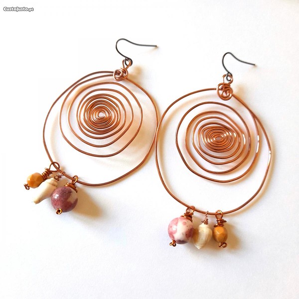 Preço: 19 €Brincos grandes espirais com pedra semipreciosa thulita rosa
