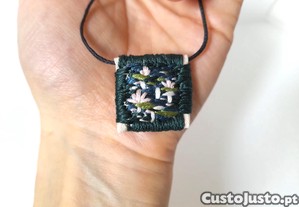 A pulseira é feita com um pingente têxtil (100% algodão, bordado à mão, com forro na parte de trás para proteger o bordado, 2,5 x 2,5 cm) e um cordão fino de algodão preto (aproximadamente 30 cm). O fecho é deslizante e ajustável, com uma conta de madeira.