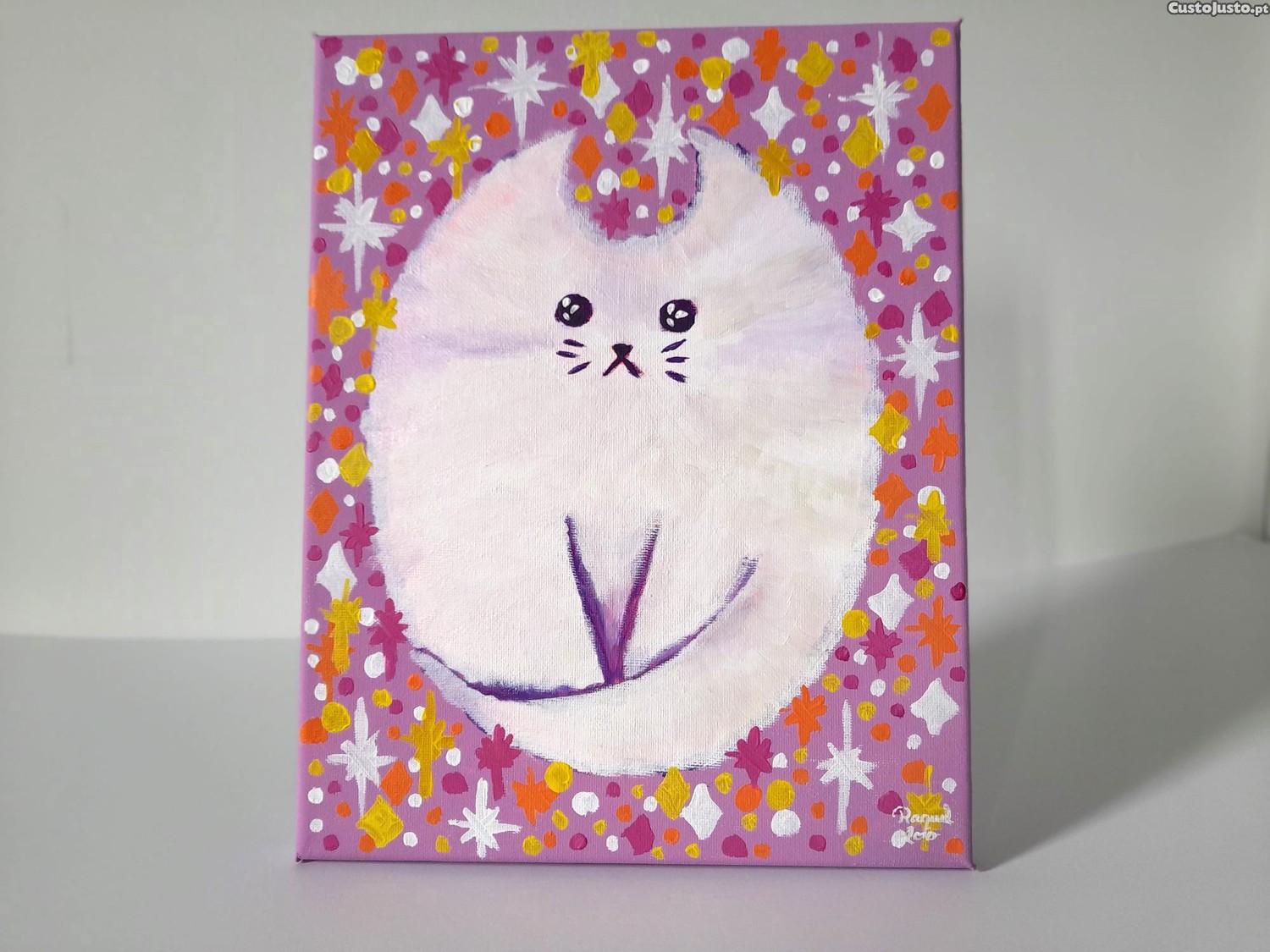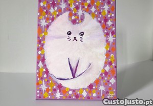 Quadro abstrato de 24cmx30cm com retrato de um gato branco (iridescente, tem nuances coloridas). Peça decorativa cor-de-rosa.