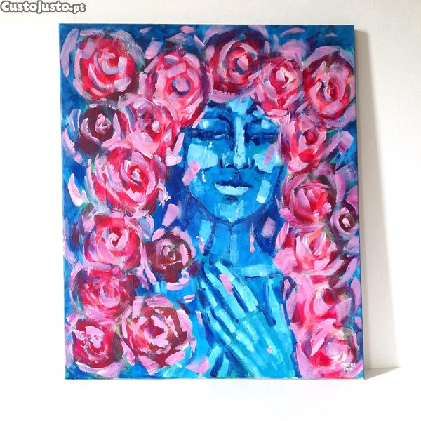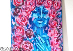 Quadro grande de 40cmx50cm com retrato de uma mulher de azul rodeada por flores cor-de-rosa. Uma peça de arte colorida e expressiva, com uma componente espiritual, ideal para decorar qualquer espaço.