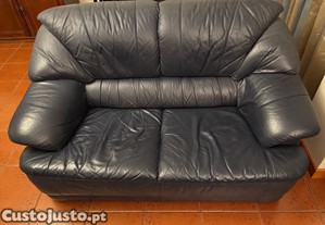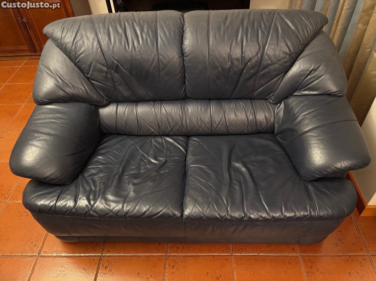 Dois sofás da marca Ramos Pinto, modelo Prestige, em pele azul-escura. Confortáveis e com bom estado de conservação, ideais para uma sala de estar. Venda em conjunto (2 sofás por 200EUR), ou isoladamente (100EUR cada). 2 lugares cada (150cm de comprimento).