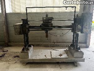 Máquina robusta com estrutura metálica completa, carro de deslocamento horizontal e motor instalado.