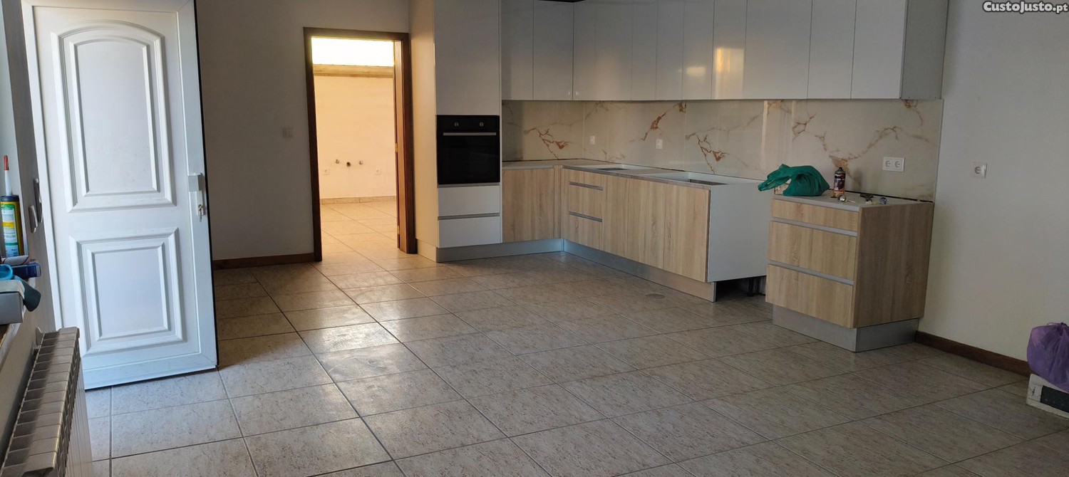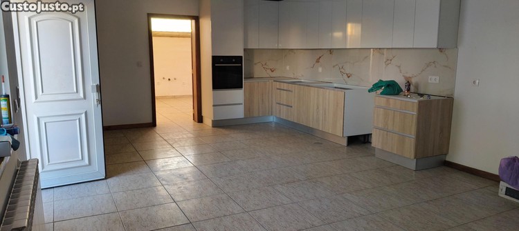 Cozinha com moveis, placa, forno, esquentador, exaustor, lareira com recuperador;